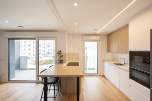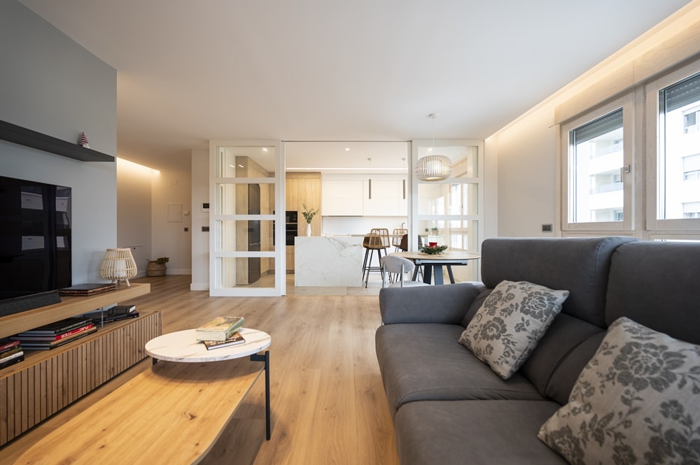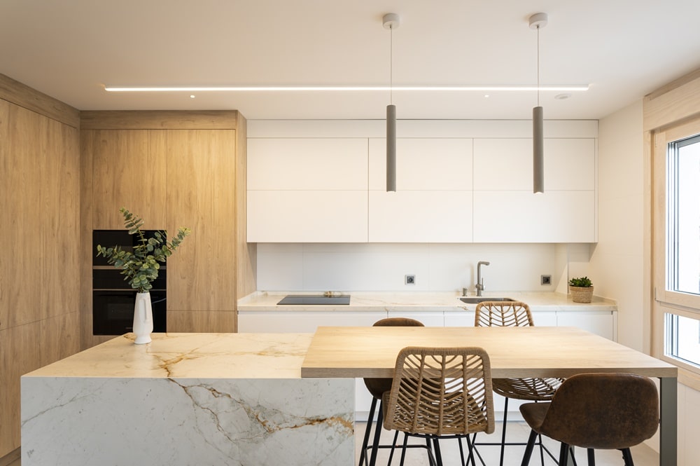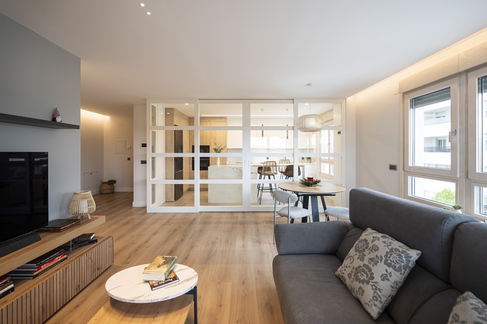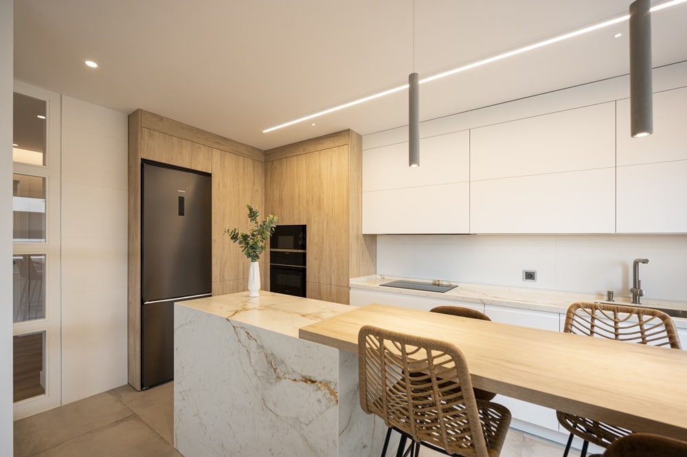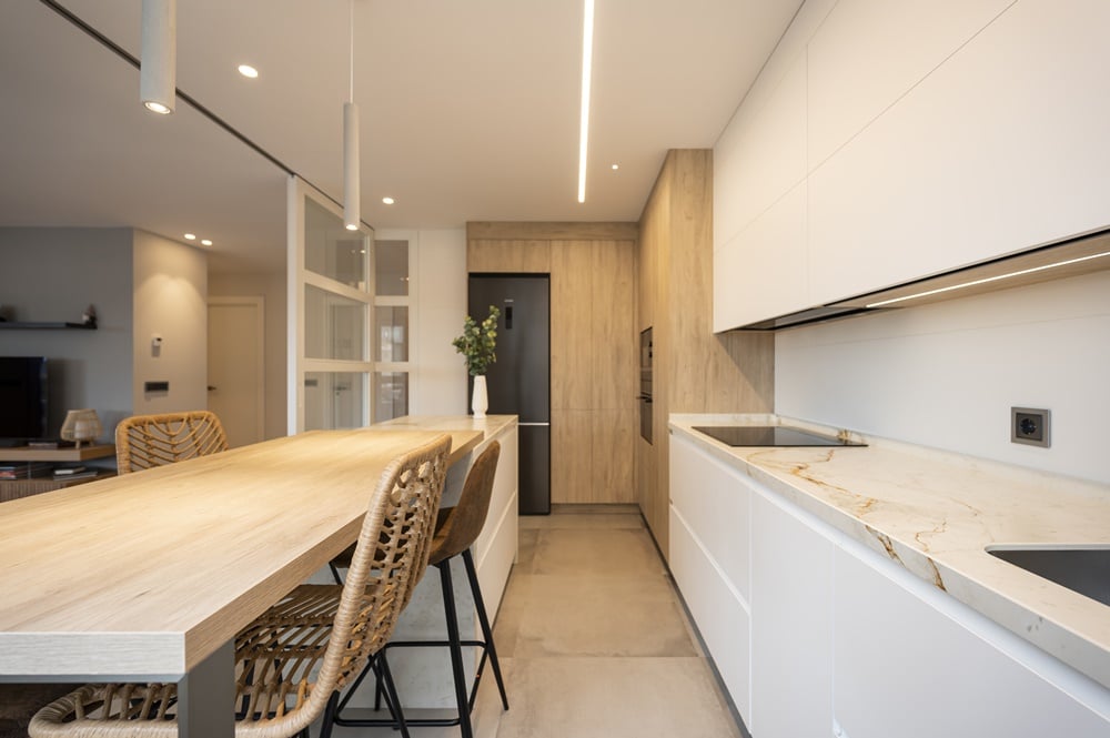 Adoramos los proyectos de obra nueva, siempre hay un sentimiento de ilusión por estrenar algo, una cocina, un salón, un hogar… En este precioso piso nos encontramos con una cocina semi-abierta al salón. ¿Por qué decimos semi-abierta? Pues porque tiene un cerramiento en madera blanca y cristal que hace que traspase la luz y además dispone de 2 puertas correderas que nos dan la opción de abrir o cerrar la estancia la de cocina, lo que nos aporta mucha versatilidad dentro del hogar.
