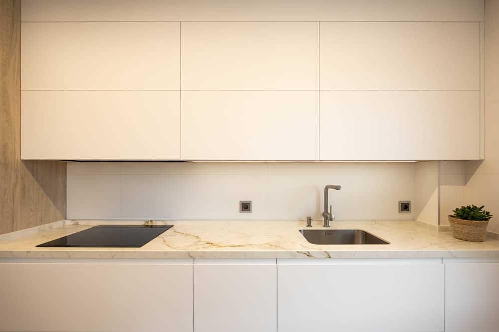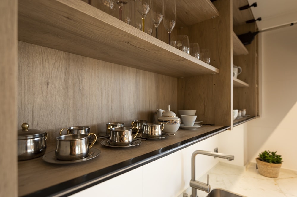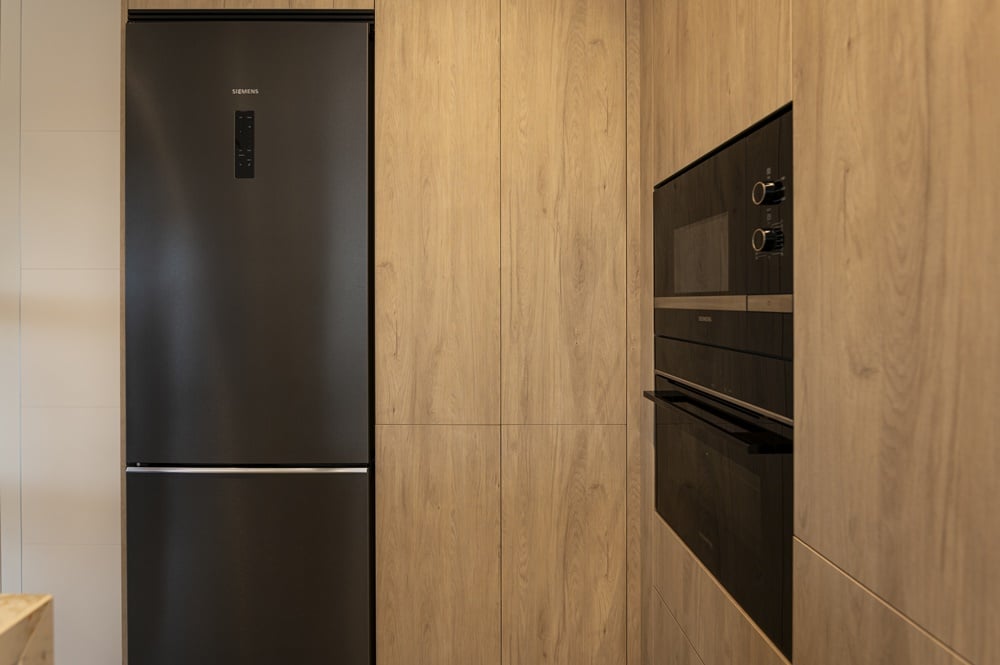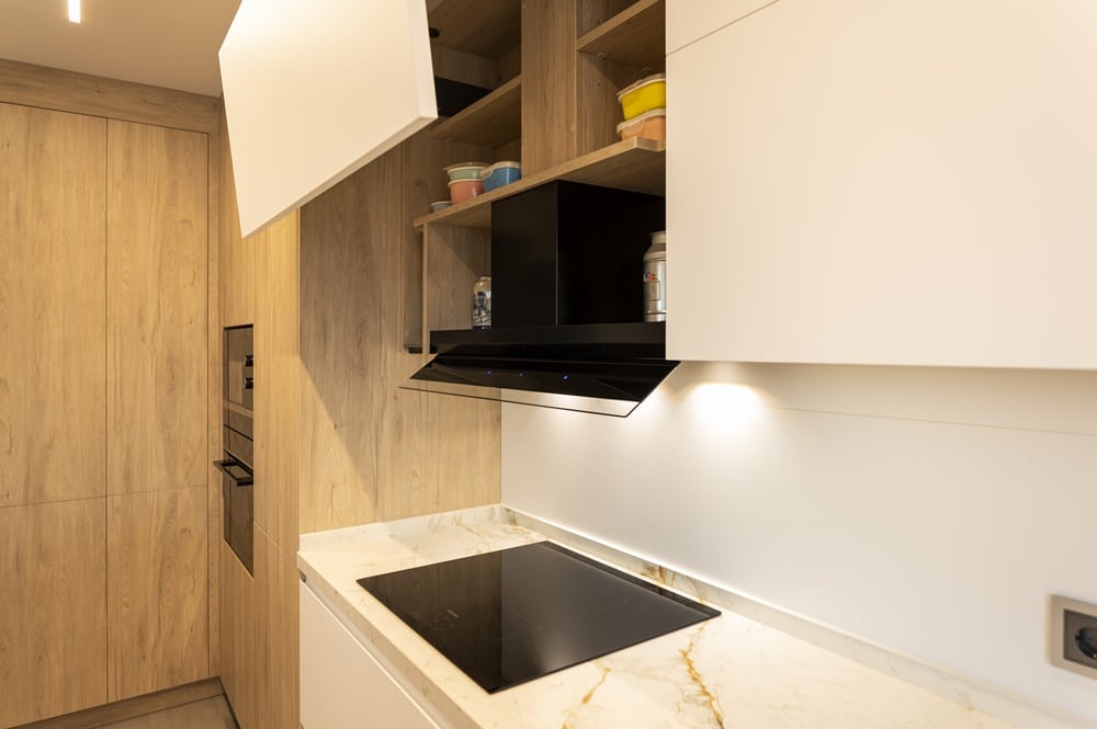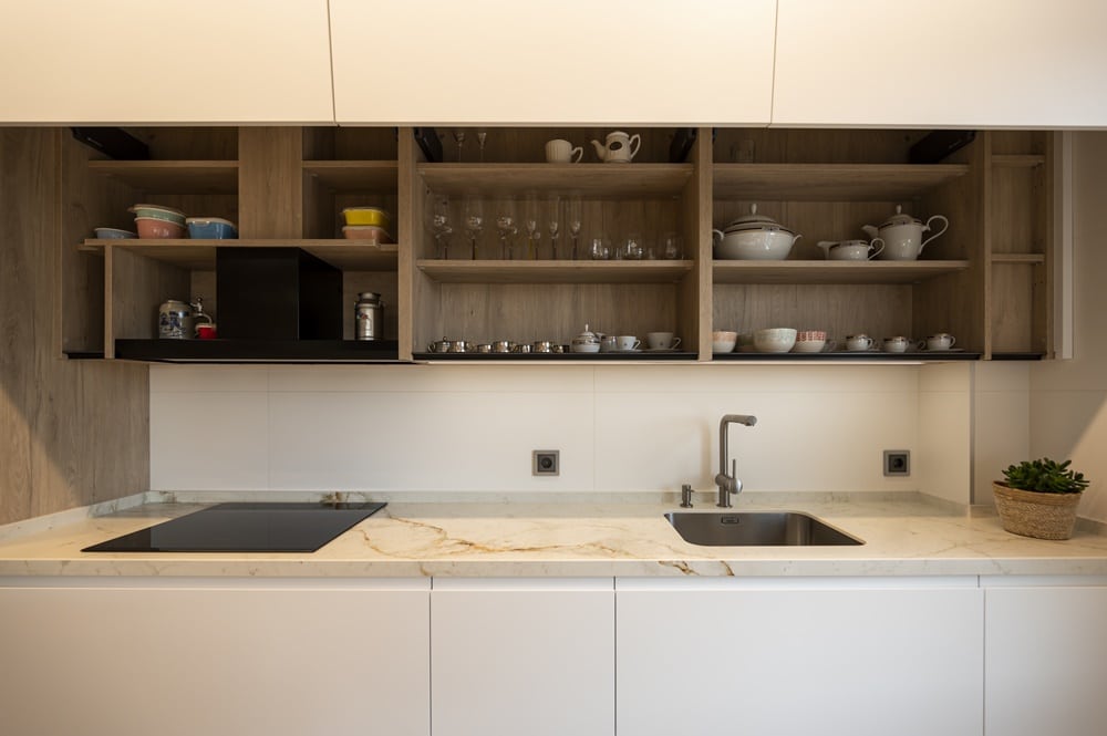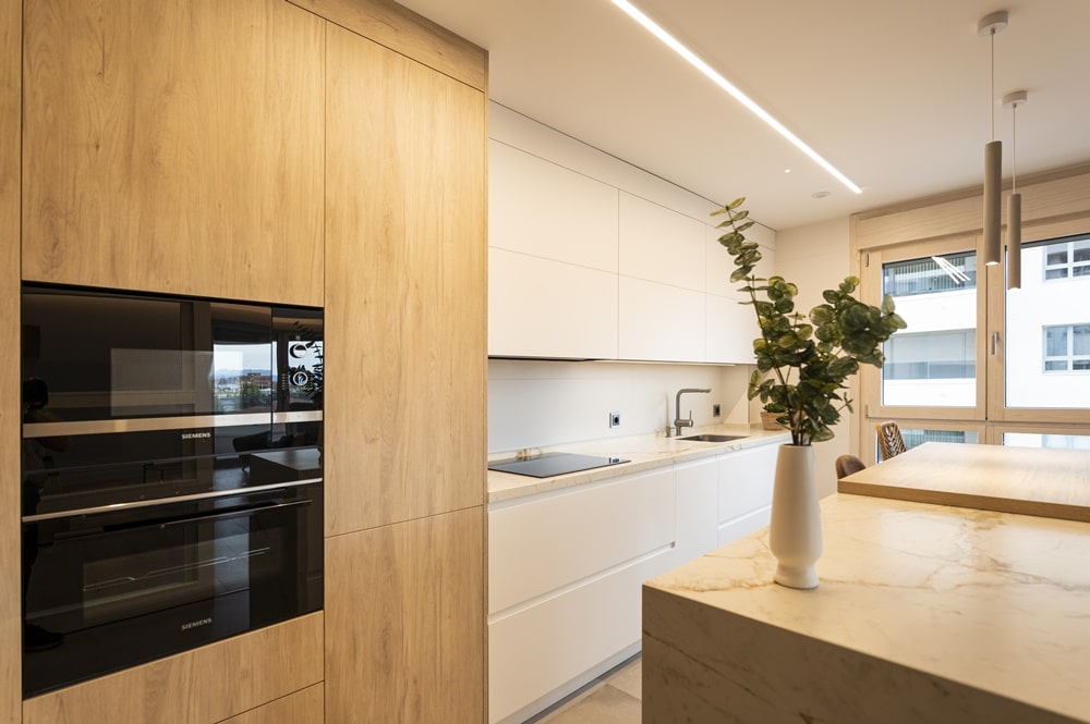 Adoramos los proyectos de obra nueva, siempre hay un sentimiento de ilusión por estrenar algo, una cocina, un salón, un hogar… En este precioso piso nos encontramos con una cocina semi-abierta al salón. ¿Por qué decimos semi-abierta? Pues porque tiene un cerramiento en madera blanca y cristal que hace que traspase la luz y además dispone de 2 puertas correderas que nos dan la opción de abrir o cerrar la estancia la de cocina, lo que nos aporta mucha versatilidad dentro del hogar.