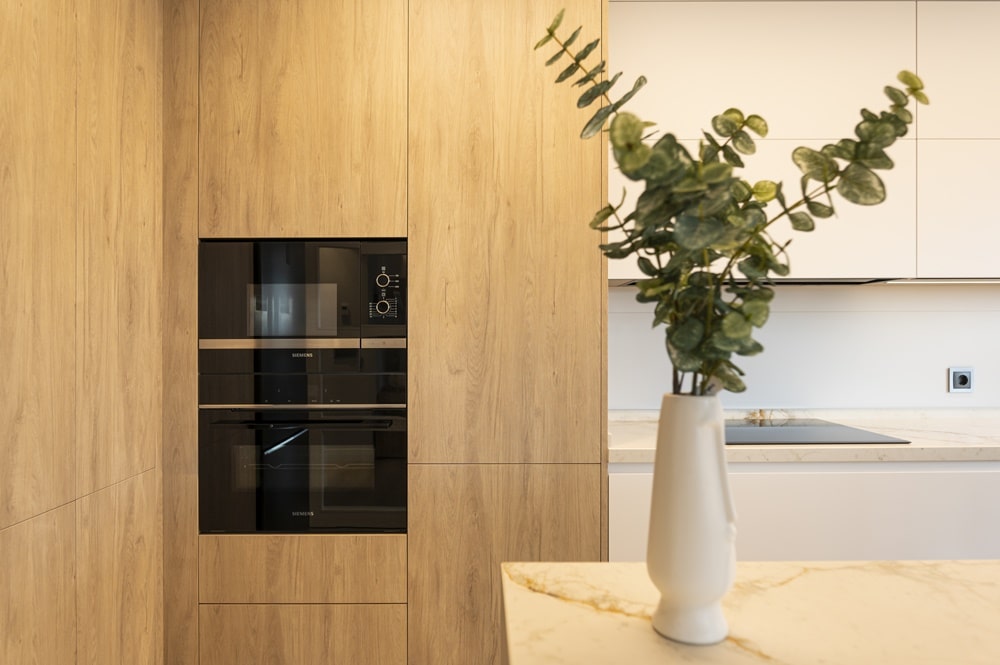 El frente principal que va en blanco mate, guarda simetría, pero a su vez dispone una gran capacidad de almacenamiento, aprovechando hasta el mínimo rincón en el caso por ejemplo del mueble campana. Además los interiores van también en roble, lo que le aporta un toque de calidez cada vez que abrimos uno de nuestros muebles.