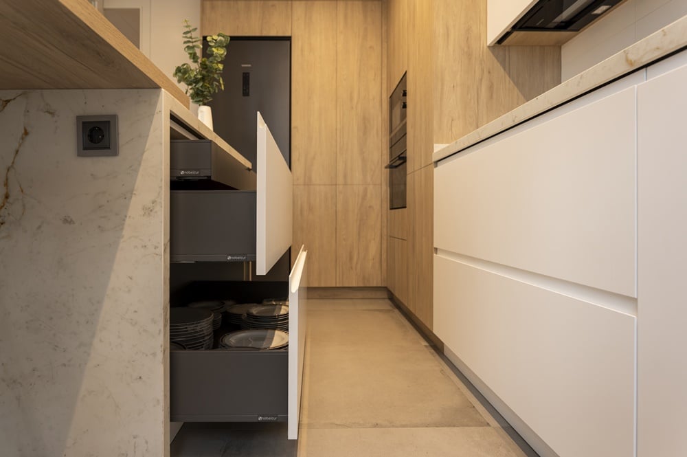 Tanto en el frente principal como en la isla se ha optado por muebles con gavetas grandes, lo que nos proporciona un gran almacenamiento a la vez que nos aporta confort dentro de la cocina.