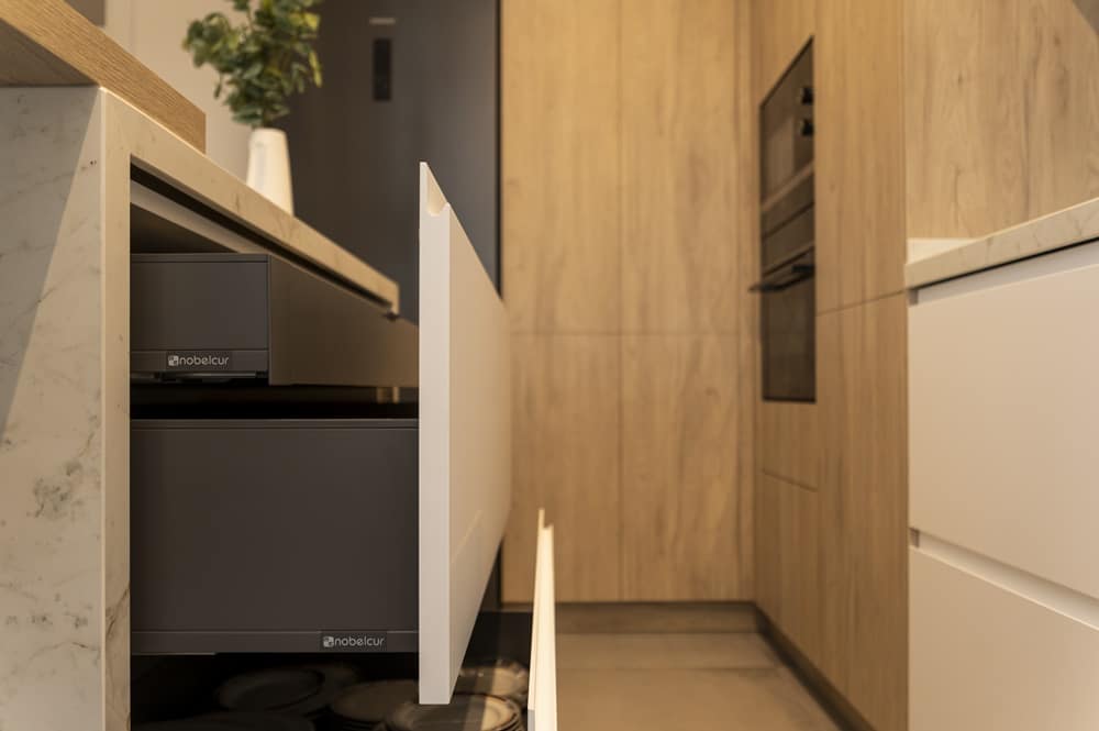 ¿Y qué os podemos decir de nuestros cajones que no os hayamos dicho ya? Resumiendo, la mejor marca de herrajes del mercado es BLUM, y dentro de BLUM el mejor cajón que tienen es el LEGRABOX. Nosotros sólo trabajamos este cajón, por lo que esto posiciona a nivel herrajes a nuestras cocinas en las cotas más altas del mercado.