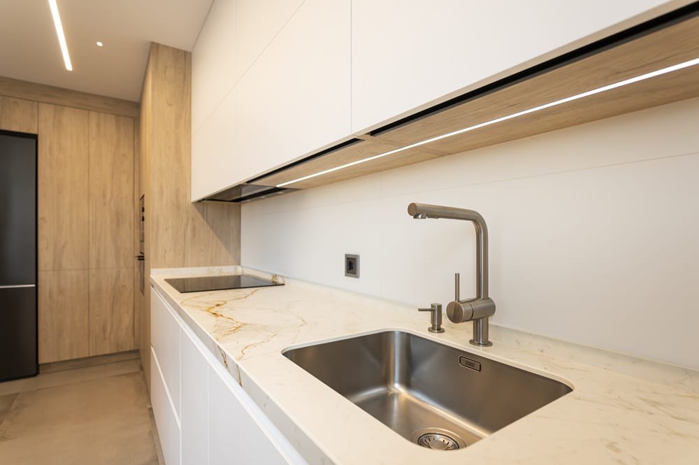 La iluminación nos marca constantemente un gran indicativo de que nos encontramos ante una cocina de gama alta, debido principalmente a que va enrasada a la perfección en la base de los muebles altos, incluso a través de varios muebles consigue la continuidad.