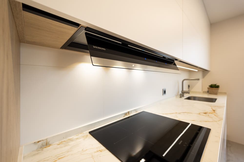 En España es tendencia claramente las campanas integradas, mucho más que en cualquier otro país de Europa, y aquí como no podía ser menos lleva una preciosa campana de Siemens, y tremendamente potente y funcional.