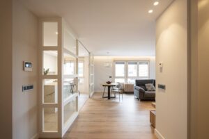Al tratar se dos zonas, dejamos como siempre una zona de paso, en este caso la zona de paso nos la marca el impresionante ventanal que va de suelo a techo aportando un torrente de luz espectacular.